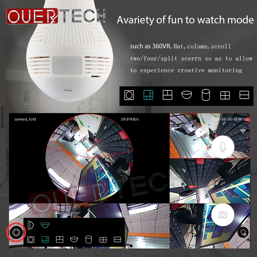 OUERTECH 360 Two way audio white light Bluetooth music bulb Panoramic 960P Full Color Wireless Smart IP Camera support 128g